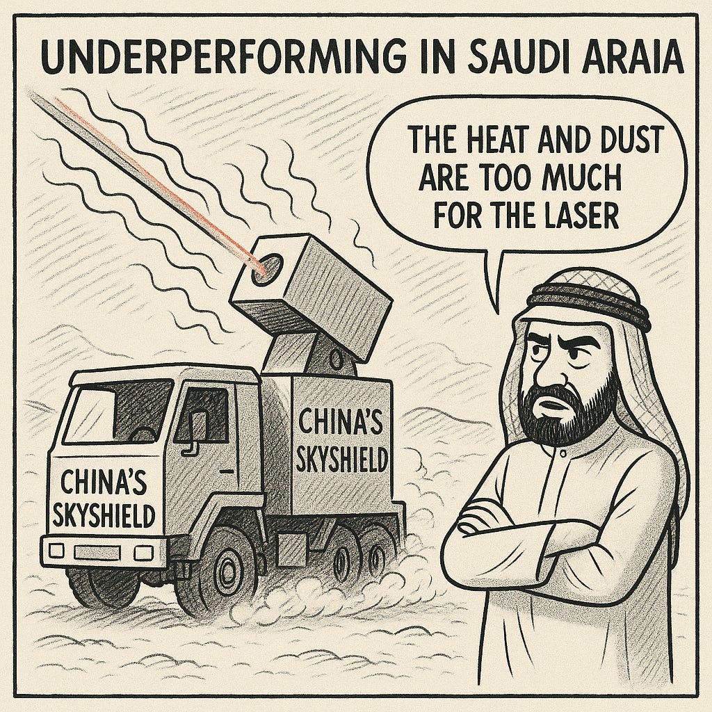 Bottom Line Up Front (BLUF): Saudi Arabia's deployment of China's SkyShield laser-based air defense system has encountered significant setbacks due to desert heat and dust. The Silent Hunter laser weapon, a key component of the system, underperformed during field operations, raising concerns over its battlefield viability