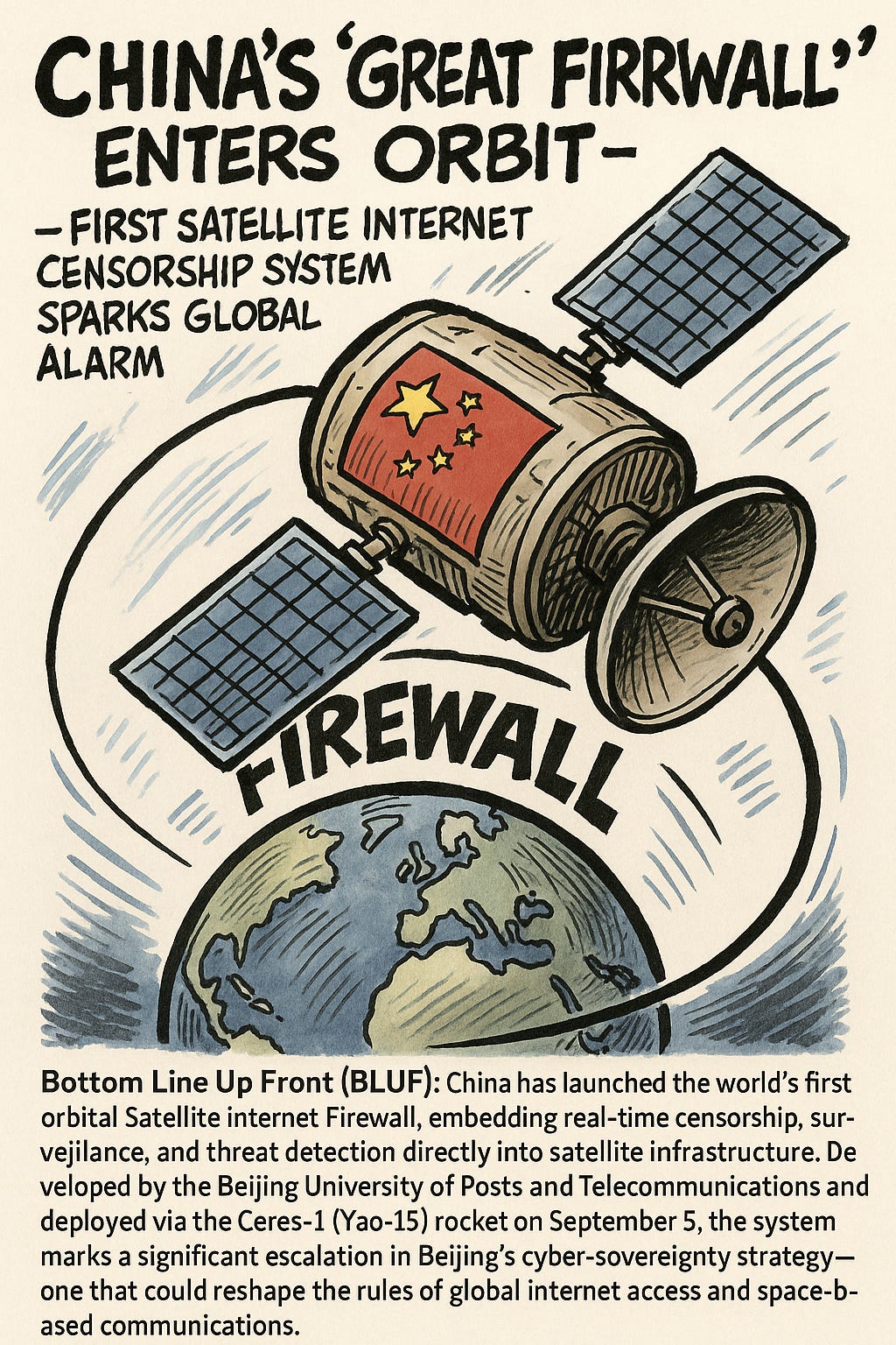 Bottom Line Up Front (BLUF): China has launched the world’s first orbital Satellite Internet Firewall, embedding real-time censorship, surveillance, and threat detection directly into satellite infrastructure. Developed by the Beijing University of Posts and Telecommunications and deployed via the Ceres-1 (Yao-15) rocket on September 5, the system marks a significant escalation in Beijing’s cyber-sovereignty strategy—one that could reshape the rules of global internet access and space-based communications.