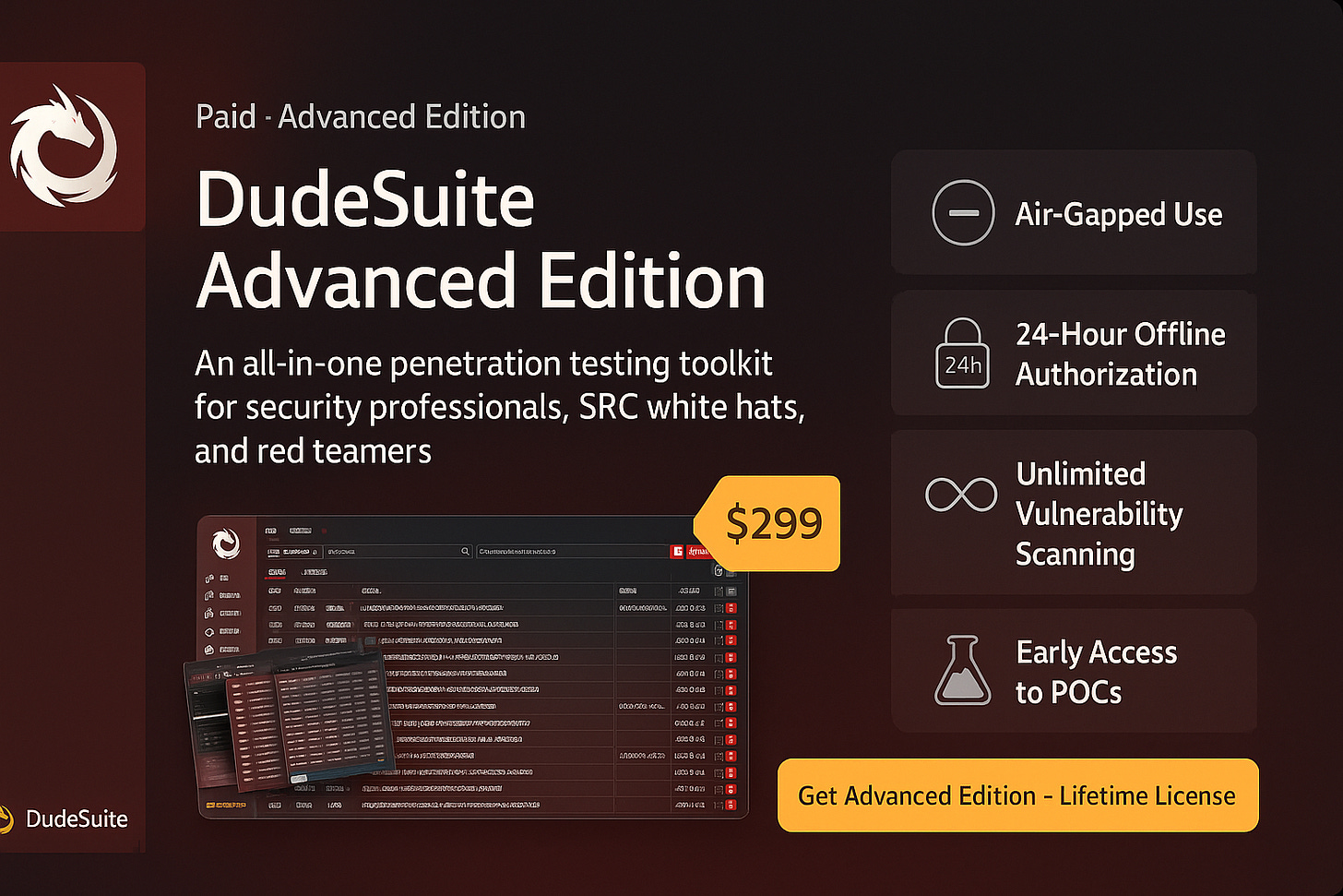 Bottom Line Up Front (BLUF): DudeSuite Advanced Edition is a paid, all-in-one penetration testing toolkit for professional security teams, SRC white hats, and red teamers. It extends the free version’s capabilities with early access to POCs, unlimited batch vulnerability scanning, seamless request replay from packet captures, and 24-hour offline authorization—making it highly practical for use in sensitive, air-gapped, or regulated environments.