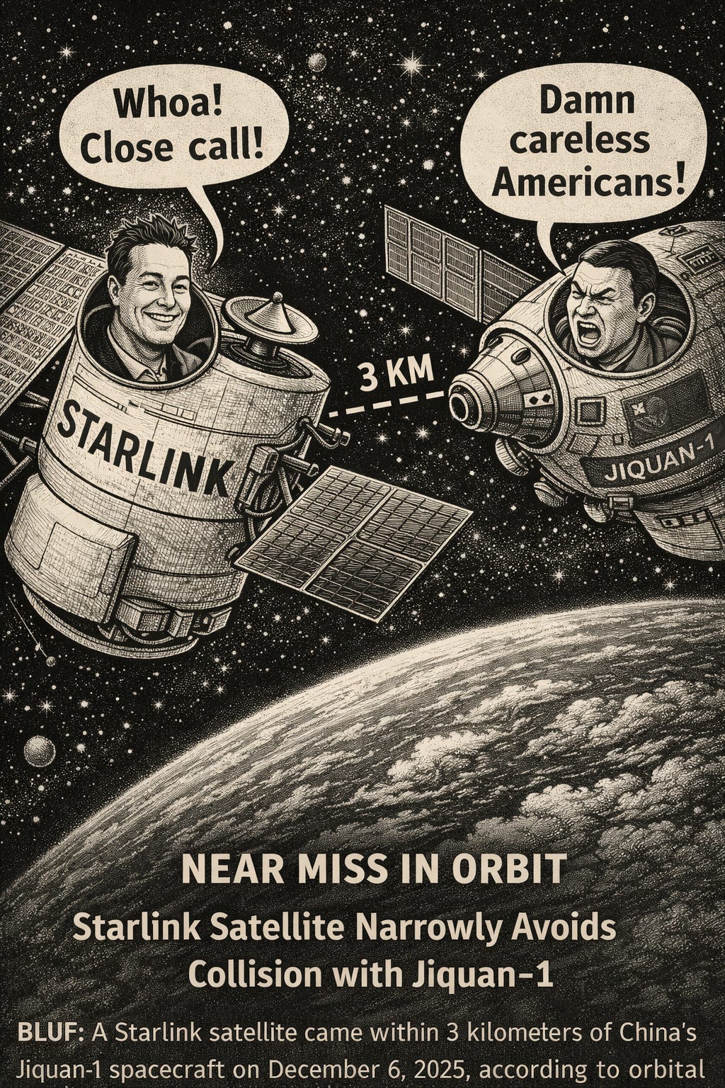 Bottom Line Up Front (BLUF): A Starlink satellite came within 3 kilometers of China’s Jiquan-1 spacecraft on December 6, 2025, according to orbital tracking data. Although no impact occurred, the proximity raised concerns among Chinese state media and defense officials, reigniting geopolitical tensions over satellite traffic management, dual-use technologies, and the cybersecurity of space-based assets.