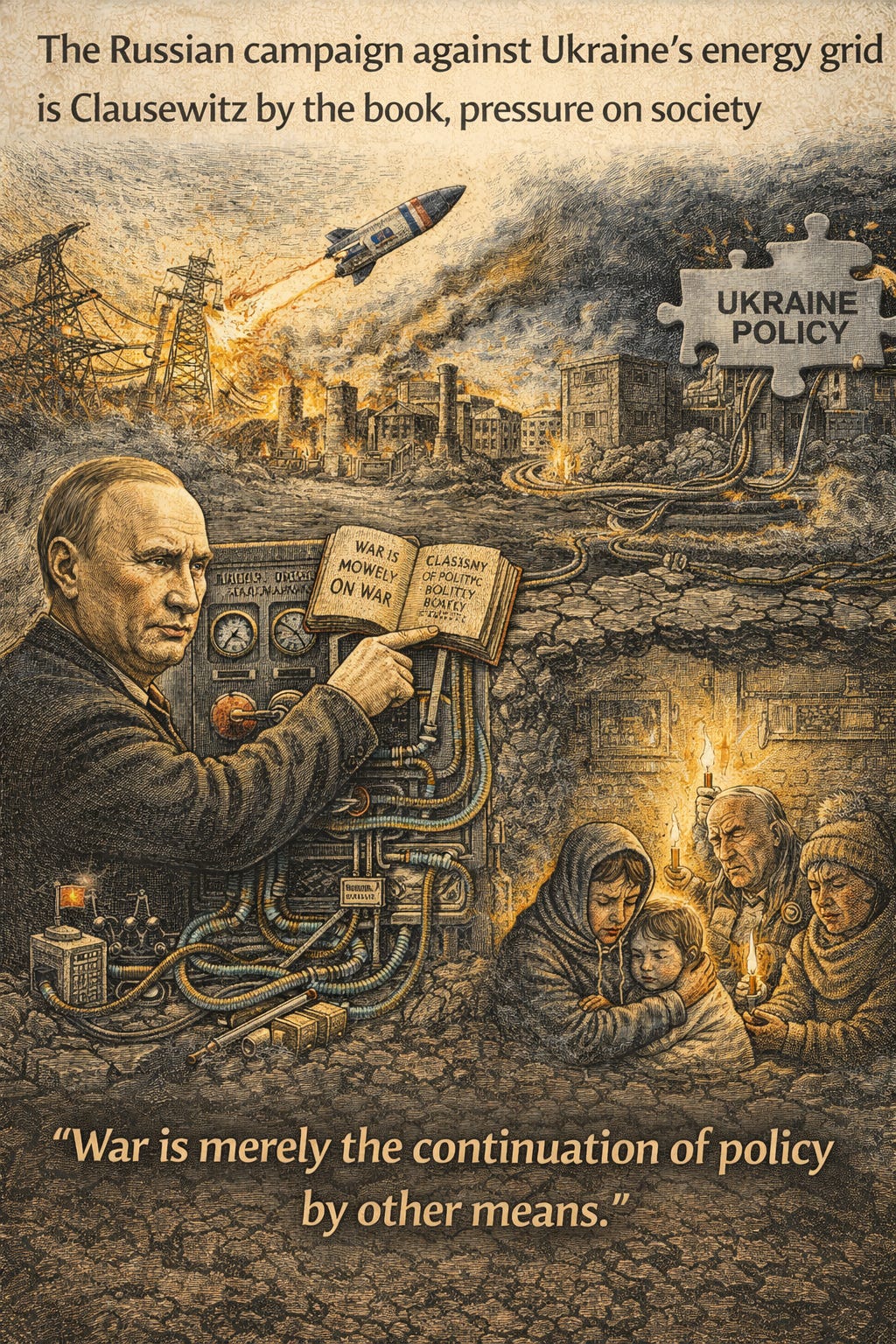 Analyst Comments: The Russian campaign against Ukraine’s energy grid is Clausewitz by the book: pressure on society as a proxy for pressuring policy. But Ukraine’s counter—distributed energy, rapid repairs, and transparent communication have turned an expected collapse into sustained resistance. The actual battlefield isn’t just transformers and power plants; it’s public belief in whether those systems will come back online. That belief shapes behavior—whether civilians stay, whether businesses operate, whether allies send weapons or wait.