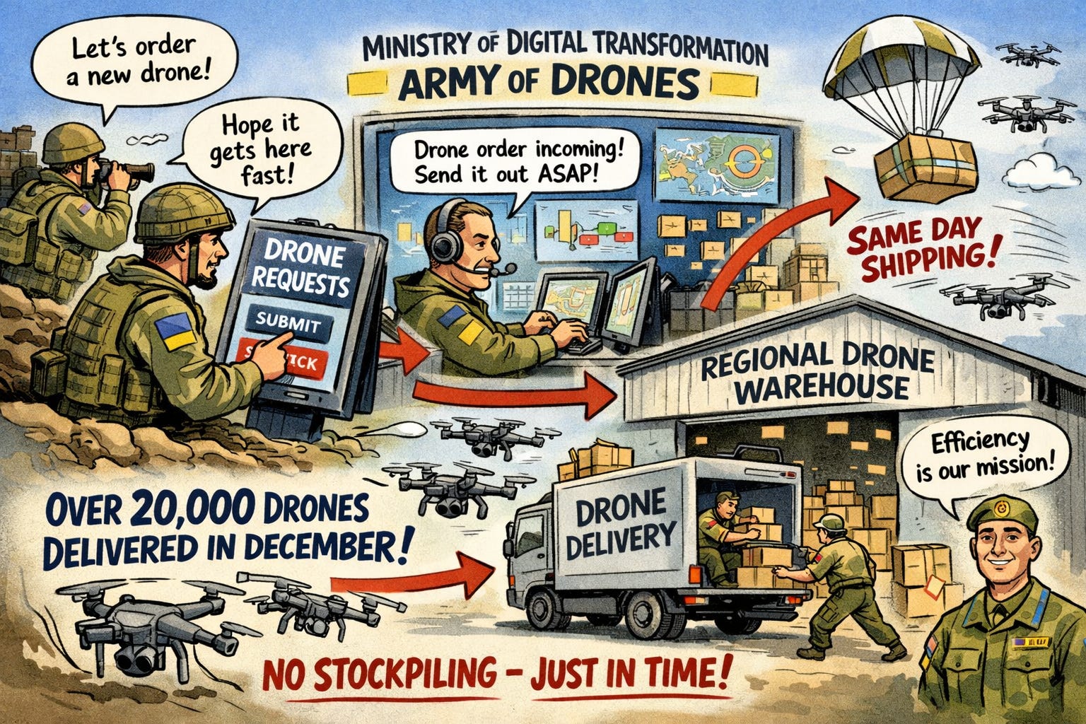Analyst Comments: Frontline soldiers can now file requests for drones through an automated system, with deliveries dispatched from regional warehouses often on the same day. The process is coordinated by Ukraine’s Ministry of Digital Transformation in partnership with the military’s “Army of Drones” initiative. Over 20,000 drones were distributed in December alone using the new pipeline. Officials say the system also helps track battlefield demand trends and prevent inefficiencies in stockpiling.